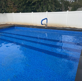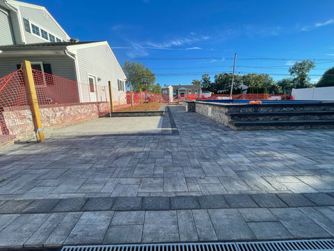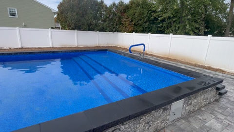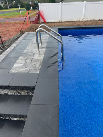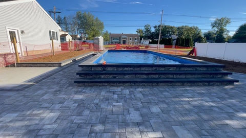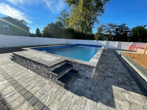 This striking project features a raised rectangular pool design surrounded by a beautifully textured paver surface in slate and charcoal tones. The standout feature is the dual wide-entry staircases, perfectly balanced on either side for effortless access and eye-catching symmetry.